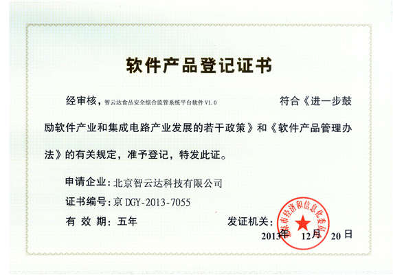 軟件產(chǎn)品登記證書——智云達(dá)食品安全綜合監(jiān)管體統(tǒng)平臺(tái)軟件