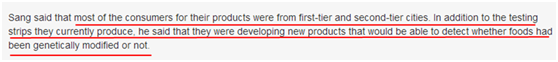 “在過去的一年里,食品安全快速檢測產品已經被越來越多的人使用”,??偨榻B說,“大多數人因為無法支付第三方檢測平臺和專業實驗室的高額費用,轉而使用此類方法。目前使用這些快檢產品的消費者大多來自一線和二線城市,我們一直不斷研發新產品,目前正在研發能夠檢測轉基因的產品。”