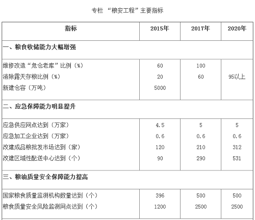 通過(guò)實(shí)施“糧安工程”,將全面深化細(xì)化和拓展《糧食行業(yè)“十二五”發(fā)展規(guī)劃綱要》目標(biāo),并使其更清晰完善。進(jìn)一步加強(qiáng)糧食倉(cāng)儲(chǔ)物流設(shè)施、糧油質(zhì)量安全檢驗(yàn)監(jiān)測(cè)能力建設(shè)和農(nóng)戶(hù)科學(xué)儲(chǔ)糧專(zhuān)項(xiàng),補(bǔ)充完善應(yīng)急供應(yīng)體系、強(qiáng)化糧情監(jiān)測(cè)和促進(jìn)節(jié)糧減損等相關(guān)目標(biāo),并將相關(guān)建設(shè)目標(biāo)延伸到“十三五”時(shí)期。
