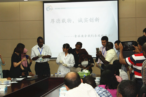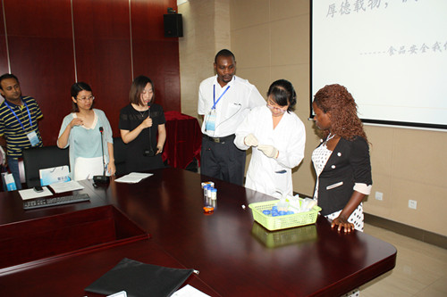技術人員邀請訪問團友人一起動手實際操作,親自體驗快檢產品操作便捷、測定時間短、檢測結果易于分辨的優(yōu)勢。