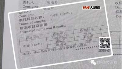 然而,湖南經視新聞調查報道,這家湖南知名的餐廳送檢的一份兒童牛排(檢測單位:湖南出入境檢驗檢疫局),除了牛源性成分,還檢測出有鴨成分。