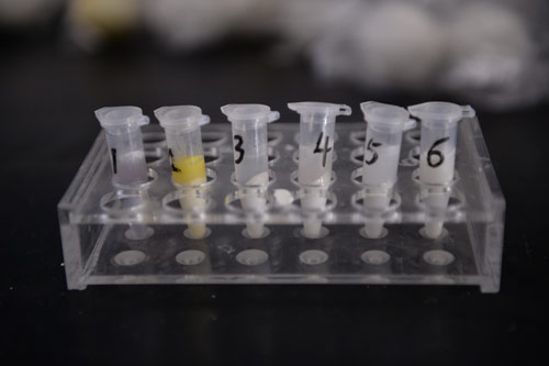 北京智云達技術工程師楊老師和王老師首先將樣品粉碎,通過使用北京智云達自主研發生產的快速檢測產品:黃曲霉毒素B1膠體金檢測卡,對樣品溶液進行檢測。