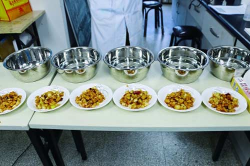 檢測(cè)用品:6個(gè)餐盤,外賣宮保雞丁兩份、小蘇打、洗滌靈、淘米水、吸油紙。