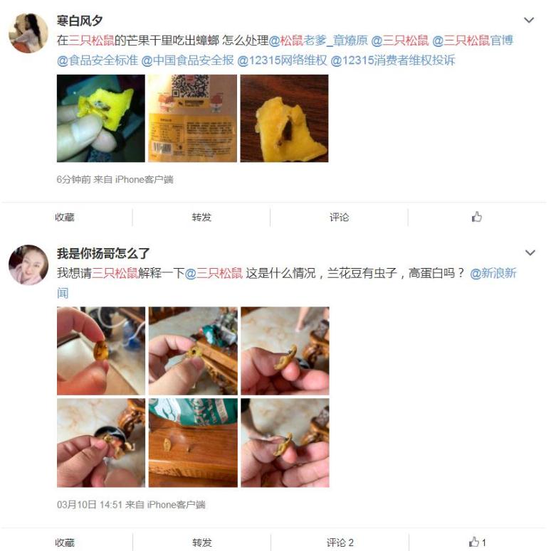 中新經緯客戶端在微博上看到,不僅是劉洋和阿維,其他消費者也表示曾在三只松鼠的產品中吃出過蟲子。