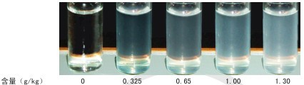 甜蜜素經(jīng)酸化后與顯色試劑反應,生成一種乳白色沉淀,穩(wěn)定性較好,而且混濁度與溶液中甜蜜素的含量成正比。