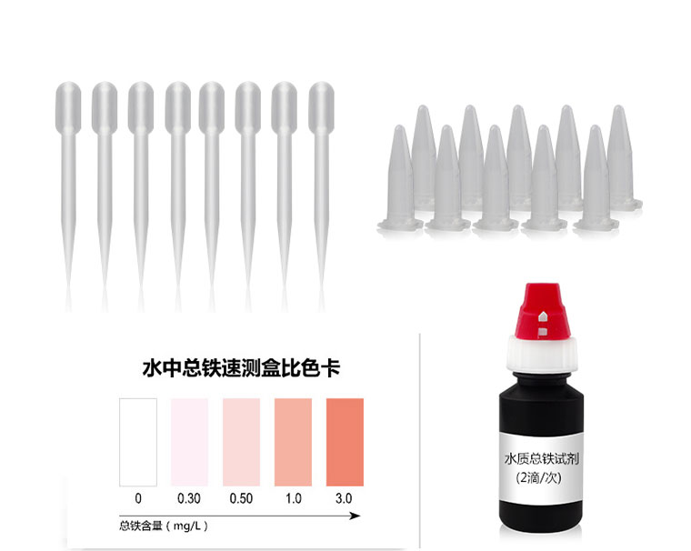 水中鐵離子與檢測試劑反應(yīng)生成橙紅色物質(zhì),含量越高顯色越深。