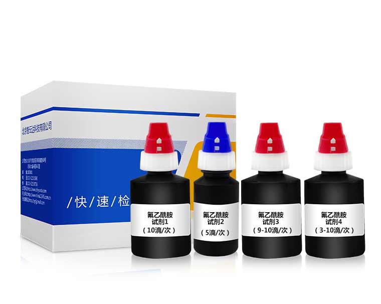 取待檢液 1mL 左右于試管中,加 10 滴氟乙酰胺檢測試劑 1,再加 5 滴氟乙酰胺檢測試劑 2,置沸水中水浴 5min(使其充分水解成氟乙酸鈉釋放出氨)。取出放冷,加 9 ~ 10 滴氟乙酰胺檢測試劑 3(調(diào) pH 值 3 ~ 5)后,加 3 ~ 10 滴氟乙酰胺檢測試劑 4(使其與氟乙酸反應(yīng)),陽性結(jié)果為粉紅或紫紅色,尤其在滴加后的液面上更為明顯(檢出限可達(dá) 50μg/mL)。測定時(shí)做空白對(duì)照試驗(yàn),陰性結(jié)果為淺黃或黃色,有些空白對(duì)照為黃棕色絮狀沉淀,靜置后上層液變成無色或淺黃色。