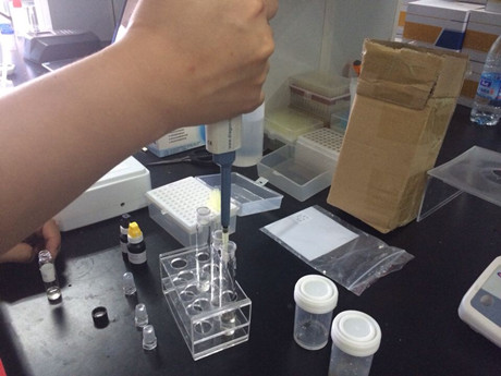 2、 取3根試管,1、2號試管作為樣品管,3號為對照管。在樣品管加入3ml樣品液,在對照管中加入3ml緩沖液,隨后分別加入20ul顯色劑和50ul酶試劑,蓋塞混勻靜置10min。加入20ul底物,混勻后迅速倒入比色皿,放入農殘儀進行檢測。