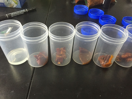 我們隨機取一點火鍋底料,放入干凈的容器中,加入5ml蒸餾水進行溶解,發現有幾種由于含油量較高,凝結成塊,無法很快溶解,因此我們對其稍微加熱,使得完全溶解。完全溶解后即得到我們的火鍋樣品。
