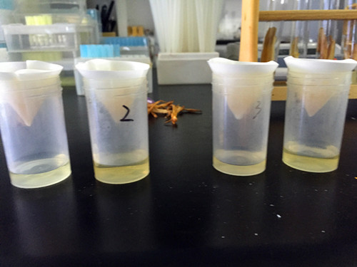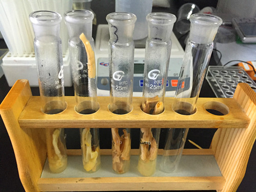 首先我們將各個樣本的黃花菜每個稱重1.25克放入25ml比色管中,加入0.5ml試劑C,加蒸餾水20mL,超聲浸提15min,由于上層溶液不澄清,加入A溶液和B溶液各0.5mL,然后加蒸餾水定容到25mL刻度線,搖勻,靜置5min,過濾,濾液(即樣品液)備用。