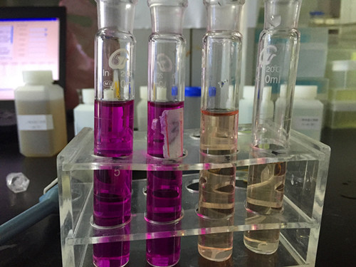 然后取一支10mL比色管,加入1mL樣品液,加入C溶液80μL,加蒸餾水至10mL刻度線,加入D溶液0.5mL,搖勻,開蓋靜置10min,加入F溶液0.5mL,迅速蓋塞顛倒兩次,迅速加入E溶液1mL,蓋塞混勻,靜置7min。處理完畢后作為樣品管。空白管:空白管內加入蒸餾水替代樣品液,其余步驟與樣品管相同