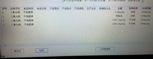 之后先用空白管校準,再檢測樣品管得到各個樣品二氧化硫含量都顯示只有2號為不添加二氧化硫的合格樣本,其他都添加了二氧化硫,但是其中1號為添加了少量二氧化硫的合格樣品,我國規定黃花菜中的二氧化硫的添加量為200 mg/kg,其他兩種含量分別為1907.1 mg/kg和1336.3 mg/kg,遠遠超出了我國的國家標準,為不合格產品。