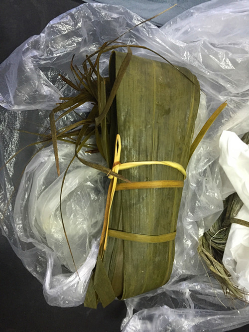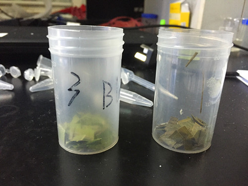 首先我們將文先生寄送過來的兩種粽葉都進(jìn)行剪碎取樣,稱取 0.8g 樣品于提取瓶中,加蒸餾水或純凈水 20mL,蓋上蓋振搖 1 分鐘,放置 10min,期間可振搖加快提取,其上清液為樣品液。