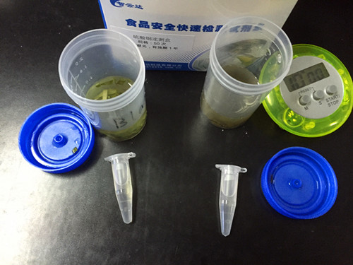 吸取 1mL 樣品液于 1.5mL 離心管中,滴加 3 滴銅試劑 A,滴加 3 滴銅試劑 B,滴加 6 滴銅試劑 C,蓋塞混勻,靜置 10min,觀察溶液顏色變化。溶液變藍(lán)色或者綠色,說明含有硫酸銅;溶液不變色說明樣品未噴灑硫酸銅。