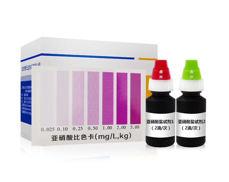 加入2滴試劑2搖勻靜置10分鐘后與標(biāo)準(zhǔn)比色卡對比,該比色卡上的數(shù)值乘上10即為樣品中亞硝酸鹽的含量mg/kg(以NaNO2計(jì))。