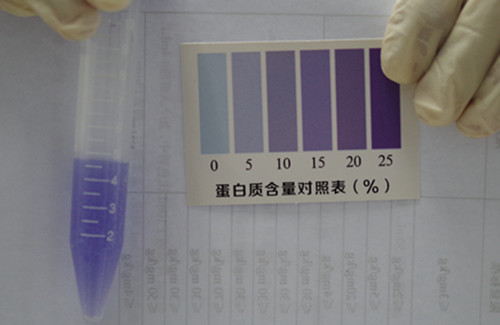 取4 mL顯色液加入比色管中,蓋上蓋,用力將奶粉全部搖溶,顯色3分鐘,在3~5分鐘內(nèi)將比色管襯在白紙上與標(biāo)準(zhǔn)比色卡進(jìn)行對(duì)比,找出與乳粉蛋白質(zhì)標(biāo)準(zhǔn)比色卡上相近的色階,即為每100g乳粉樣品中蛋白質(zhì)的含量。