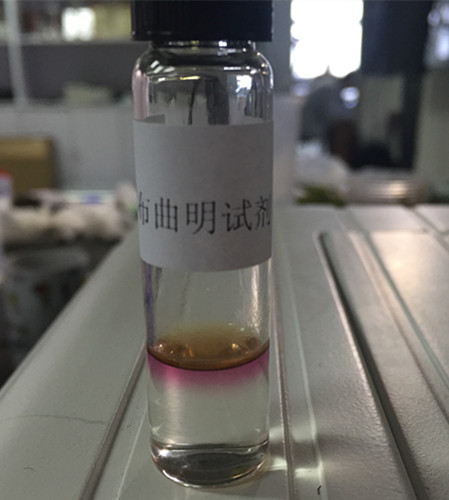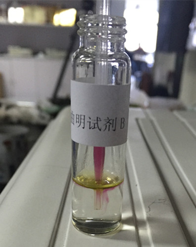 1 min后,B瓶下層溶液產生渾濁或沉淀,可判定含有西布曲明,即為陽性(+);無沉淀則判為陰性(-);結果顯示樣品下層溶液澄清,初步判定不含有西布曲明。
