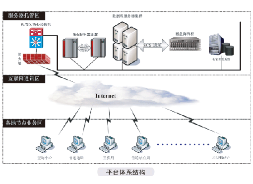 整個系統是建立在以互聯網連接為基礎的集中式業務處理系統。其總體結構分為三個層:以服務器托管區服務器構成的業務及數據處理中心、互聯網通訊區、中速及各地的業務處理節點,層次結構圖如左所示: