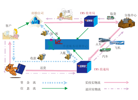 在代收貨款系統業務流程中,共有5個節點,分別是:客戶、郵購公司、EMS收寄局、EMS投遞局和中速帳務結算中心,各節點之間的關系如下圖所示: